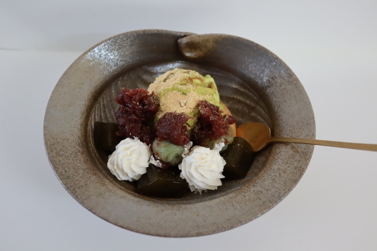 お土産でいただいたくずもちやスーパーで買ったお団子を使いました。和風の平皿にスポンジケーキを敷き、バニラアイスをON。まわりに、四角く切ったくずもちと、串からはずしたお団子をのせ、きな粉と黒蜜をかけたらできあがり。生クリームもあれば好きなように絞りましょう。