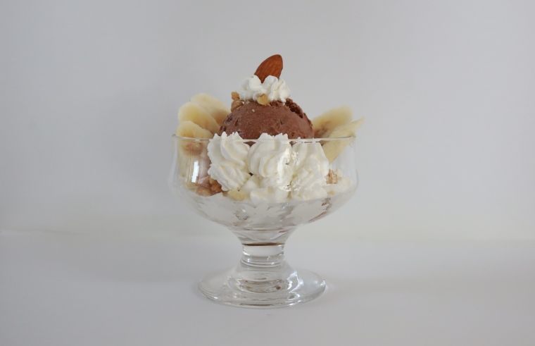 バナナ×チョコレートで作る王道のレトロ喫茶店風パフェ。背が低めでどっしりしたタイプのグラスを用意します。一番下にスポンジケーキやドーナツ、クッキーなど、溶けたアイスをすくってくれるものを平らに敷き詰めます。チョコレートアイスを真ん中にのせて、まわりにバナナやナッツ、生クリームなどを好きなように盛りましょう。