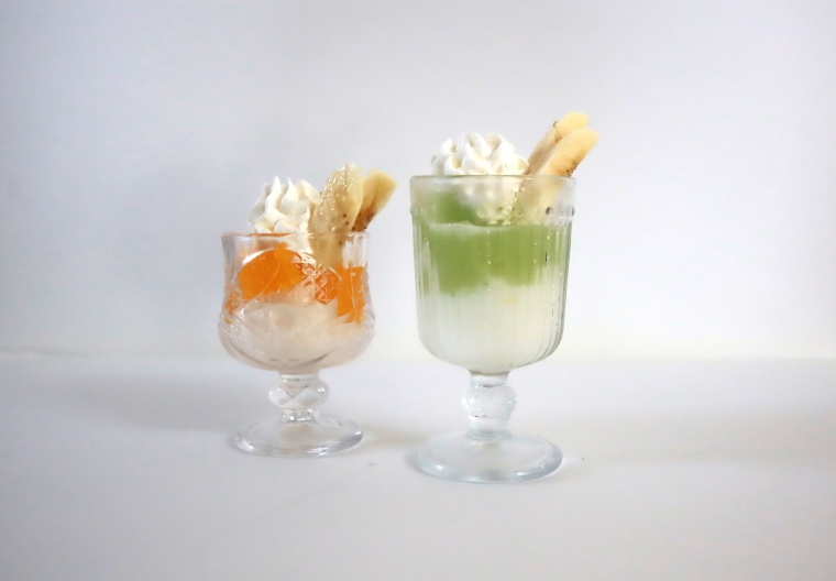 小さなグラスでつくるミニパフェ。パピコを絞り、上にメロンゼリーやミカンゼリーをのせて、生クリームをトッピングして完成。お好みでバナナやお菓子を飾っても良いですね。小さいのでちょっとだけデザートが食べたいときにも便利。お友達が集まるときなどに、たくさん作ったら喜ばれそうです。