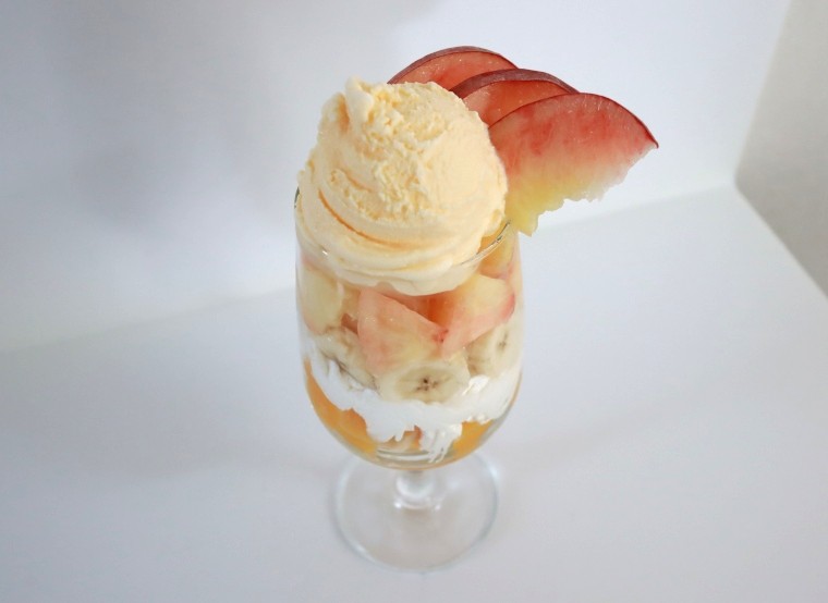 旬の果物で作りたい、フルーツパフェ。大切にしたのは美しさと、どこから見てもおいしそうか、主役の果物が引き立つか。今回はちょっと贅沢に桃を使いました。一番下にスポンジケーキ、次にカットした缶詰の黄桃を入れます。生クリームを円を描くように入れて、断面を見せたバナナをぐるりと一周並べましょう。その上にカットした桃を入れて、さらにスライスした桃をセットしたら、アイスをポンと置きます。