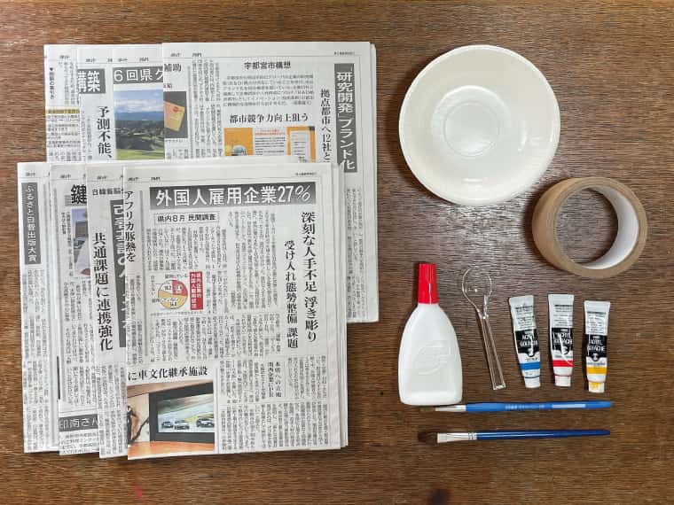 ⑤ちぎった新聞紙に水に溶いたボンドをつけて、表面全体に貼って覆います。ボンドが乾いたときに表面に張りがでて、強度が増します。テープも隠れるように上から貼ってください。