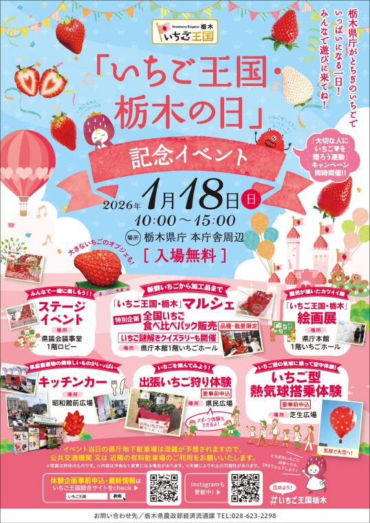 「いちご王国・栃木の日」を記念して、栃木県庁で「いちご王国・栃木の日」記念イベントが開催されます。ステージイベントやいちご・いちご加工品等を販売するマルシェ、プロスポーツチームによるスポーツ体験等が行われます!栃木県庁がいちごでいっぱいになる一日を、ご家族みなさんでお楽しみください。