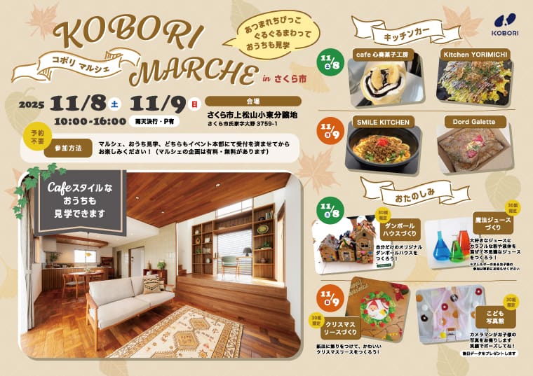 2025年11月8日(土)・9日(日)に「KOBORI Marche」をさくら市で開催します!自分だけのオリジナルのおうちが作れる「ダンボールハウス」やカメラマンがお子さまの写真撮影をしてくれる「こども写真館」、ワークショップにおいしいグルメなど多数ご用意しています。ご家族やお友だちみなさんで、ぜひ遊びに来てくださいね!