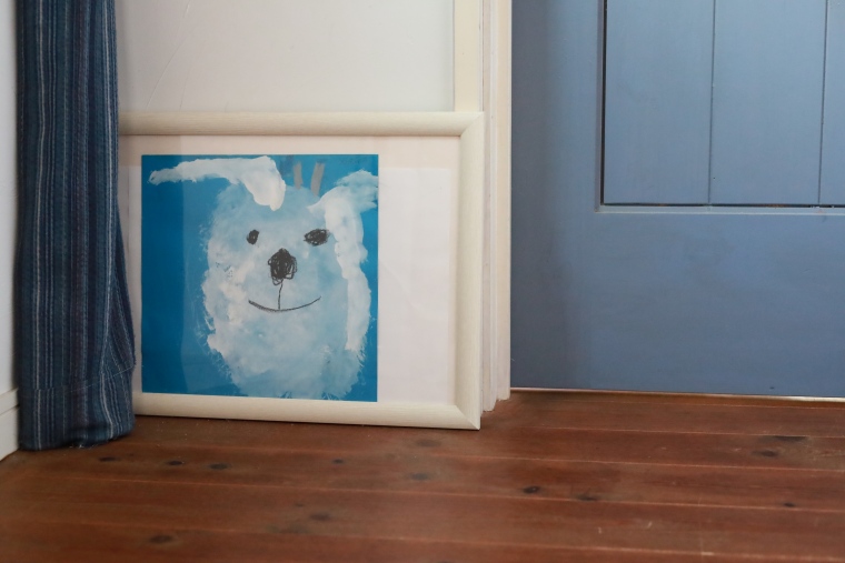 子どもが1歳ぐらいのころに描いたファーストアートの青い絵。子どもが自分で選んだ絵具がのびやかに重なり、海や空を思わせる色合いになりました。大好きな作品をいつでも眺められるよう、リビングドアの上に飾りました。大好きなこの作品を見るたび、絵具の感触を楽しむ娘の姿を思い出します。(maiko)