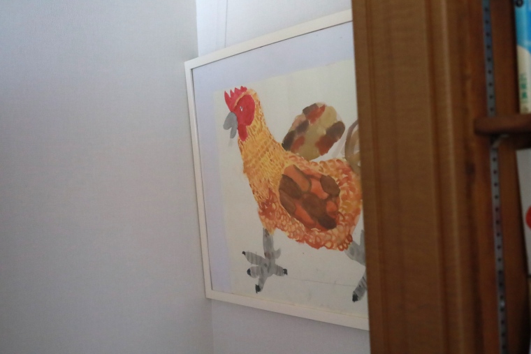 幼稚園のときに娘が描いたニワトリの絵。躍動感があり細部まで描かれていて、迫力があります。家を建てるとき、いろいろな場所につけたピクチャーレールが大活躍していて、これはトイレに飾っています。(akko)