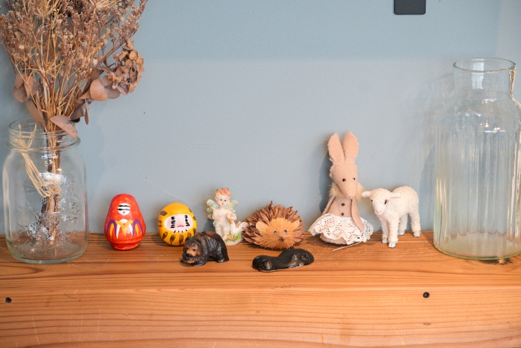 母からもらったお土産たち。真ん中のハリネズミは神戸で、その隣のレースのスカートをはいたネズミはエストニアのタリンにある手作り雑貨の店で見つけたそうです。キッチンカウンターの横に、ほかの小さな仲間たちと一緒に並べています。(yuki)