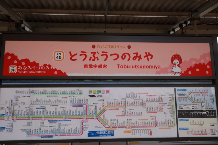 栃木県といえば、いちご。東武宇都宮線の駅名看板はすべていちご柄でした。「いちご王国ライン」なんですね~。