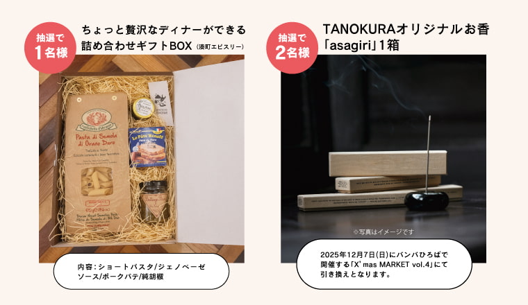 特集でご紹介している、湊町エピスリーさんの詰め合わせギフトBOXとTANOKURA オリジナルお香「asagiri」を抽選で合計3名様にプレゼントいたします。TANOKURA オリジナルお香は12月7日(日)に開催する、X’mas MARKET vol.4の会場内で引き換えとなります。