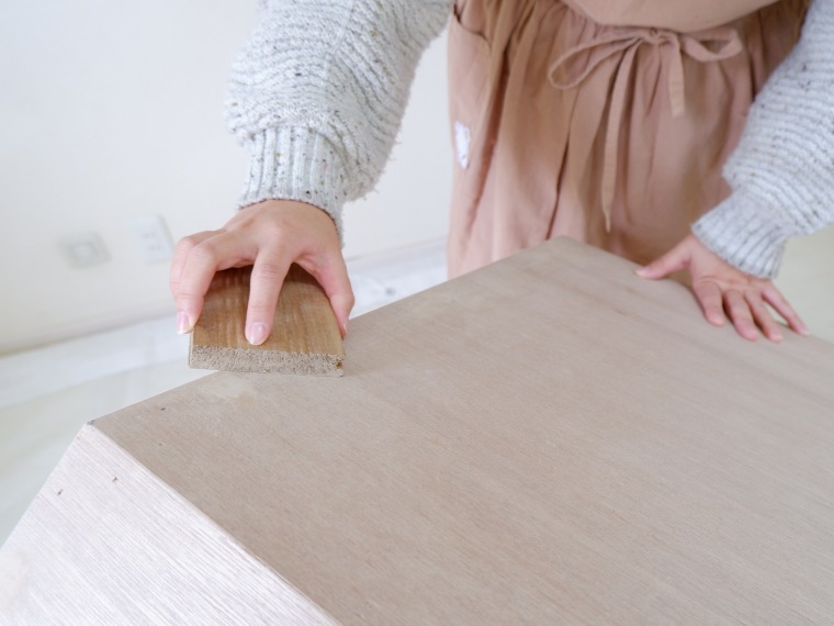 釘の頭に塗っておいたウッドパテをやすりで削って、なめらかにします。座ったときも触ったときも服や肌にひっかけないように念入りに。次に全体に下塗り材を塗ったら、着彩スタートです。