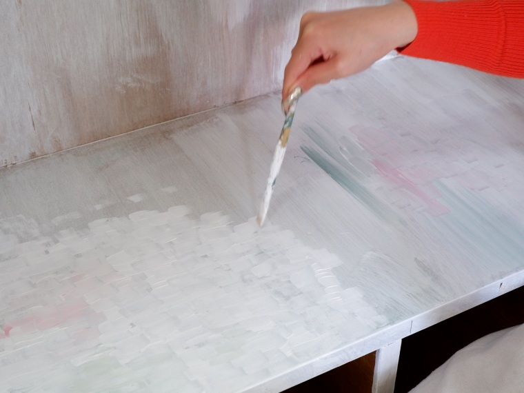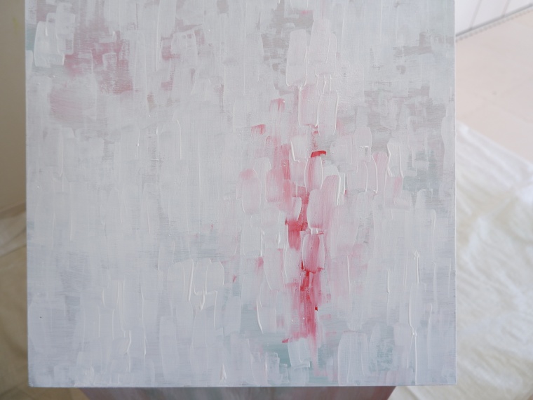 大きなはけで、全体に白を塗ります。なるべく同じ方向にはけをすべらせます。次に、細い筆で、最初に塗った向きとは違う方向へ、雫のように転々と濃い白をのせます。