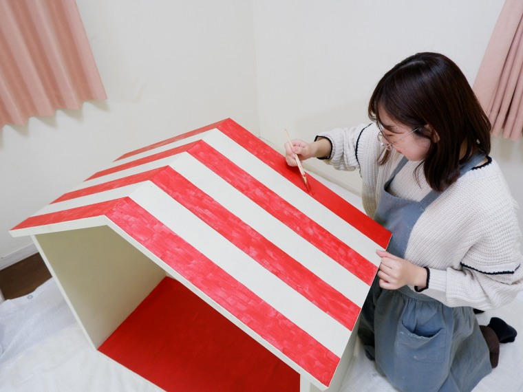屋根も赤く、まっすぐな線でストライプにしました。色がはっきり出るように、丁寧に塗り重ねていきました。